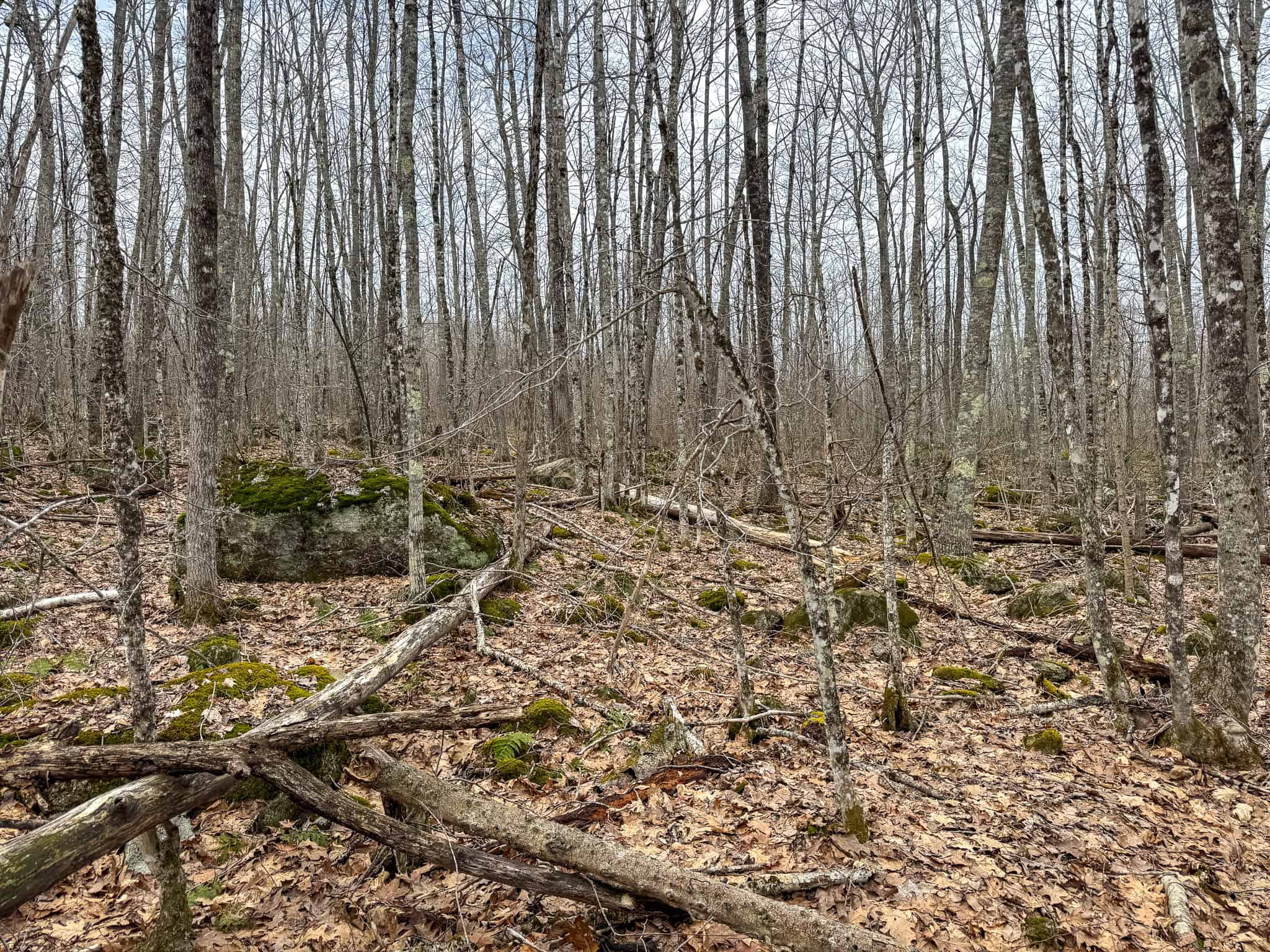 12-acre lot on Clements Road in Monroe (Map 11, Lot 41) with mature hardwood—red oak, sugar maple, and more—offering strong timber value. About 1,000’± of frontage on a marshy, unnamed brook. The land rises gradually to around 265′ in elevation, with nice ridge and distant mountain views from the top.